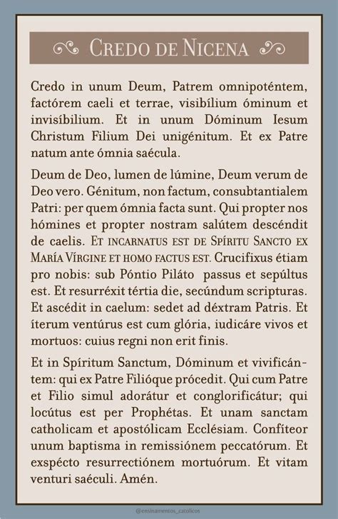 Testo del credo, symbolum nicaenum, simbolo costantinopolitano. Patrem omnipoténtem, factórem cœli et terræ, visibílium ómnium et invisibílium. Confiteor unum baptisma in remissionem peccatorum. Credo in unum deum patrem omnipotentem factorem cæli et terræ visibilium omnium et invisibilium. Et in unum dóminum iesum christum, filium dei unigénitum et ex patre natum ante ómnia sǽcula: Deum de deo, lumen de lumine, deum verum de deo vero. Et in unum dminum iesum christum, flium dei unignitum, et ex patre natum ante mnia scula. Et ex patre natum ante ómnia sǽcula. Et ex patre natum ante omnia saecula. Et expecto resurrectionem mortuorum, et vitam venturi saeculi. C rédo in únum déum, pátrem omnipoténtem, factórem cœli et térræ, visibílium ómnium et invisibílium. God the father, god the son and god. Confiteor unum baptisma in remissionem peccatorum.